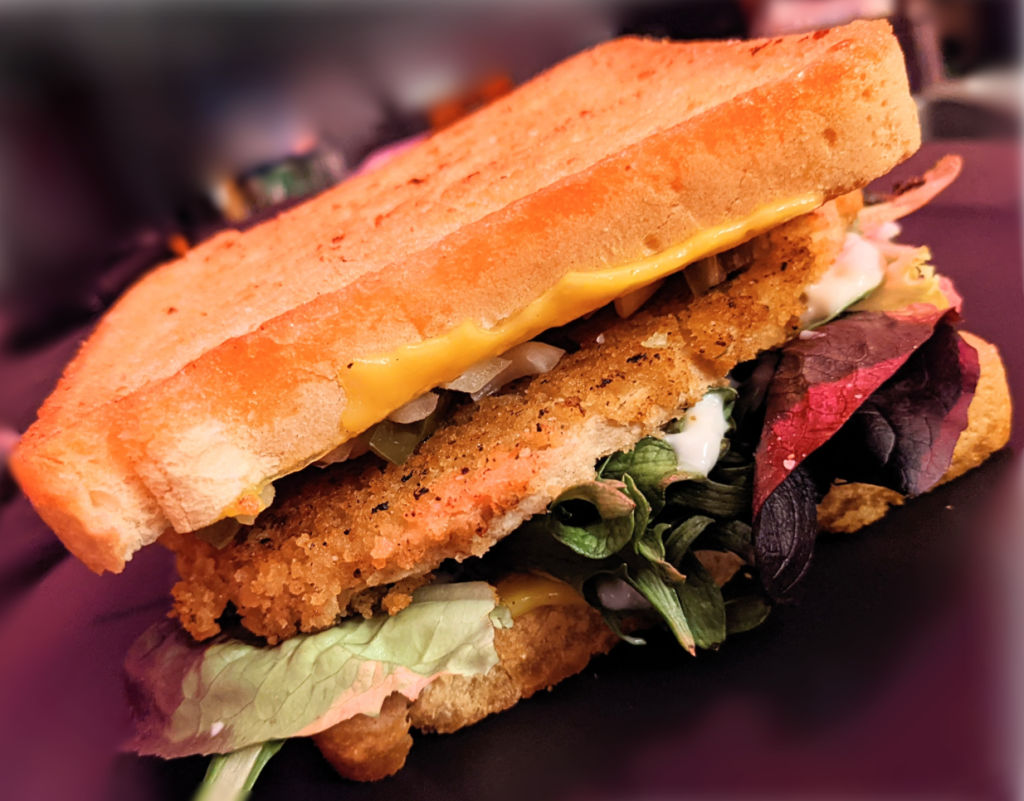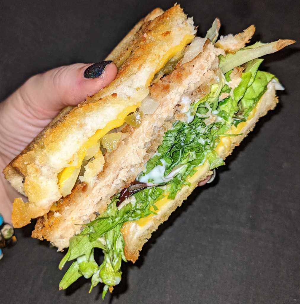 Grab a slice of toasted cheesed up bread, and add a little vegan mayo. Then layer on as much lettuce as you’d like! Add another squirt of vegan mayo when you are done, then comes the crispy Chick’n schnitzel! Balance that on top of your salad, then top that with your diced onion and jalapenos. Top it with your remaining slice of cheesy crispy bread, then optionally, sprinkle with a teeny bit of salt.