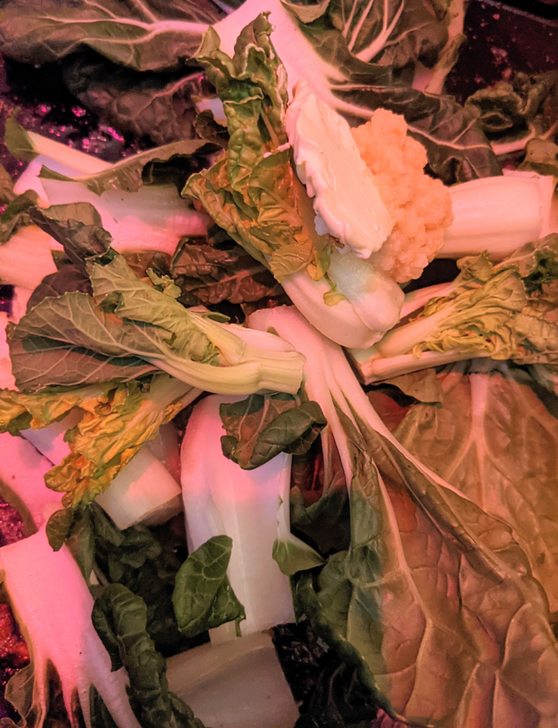 First we need to prepare out bok choy. Seperate and wash the bok choy leaves, cutting off any soft or darker bits. Prep your pan with some vegan butter and some garlic. Let the garlic sizzle into the butter for a minute, then add your bok choy. I like to cut it up into smaller bits, sometimes the whites of bok choy can be a little stringy so I like to cut then into bite sized pieces.