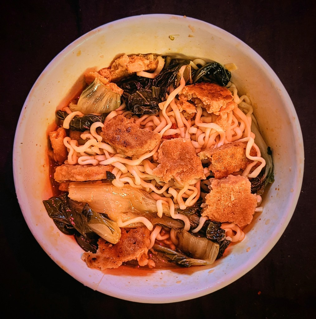 Before you start cooking up your protein start preparing your fave pot noodle, or ramen. While you are waiting for your noodles to soften, prep another pan with a little butter and place your protein in to cook up. Omni meat doesn’t take too long as it’s quite thin, I cook maybe for 4 or 5 mins per side on a medium heat. You can cook it soft or a little crispier, it will soak up your noodle sauce and broth either way!