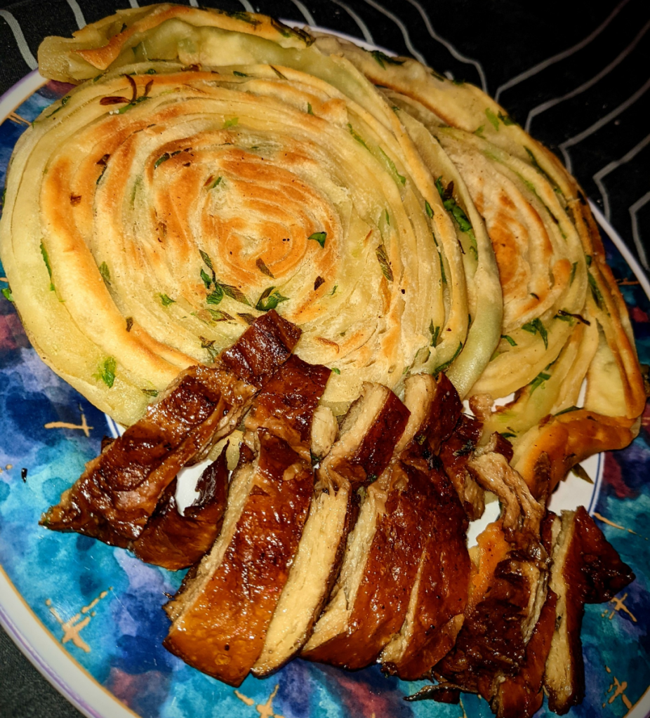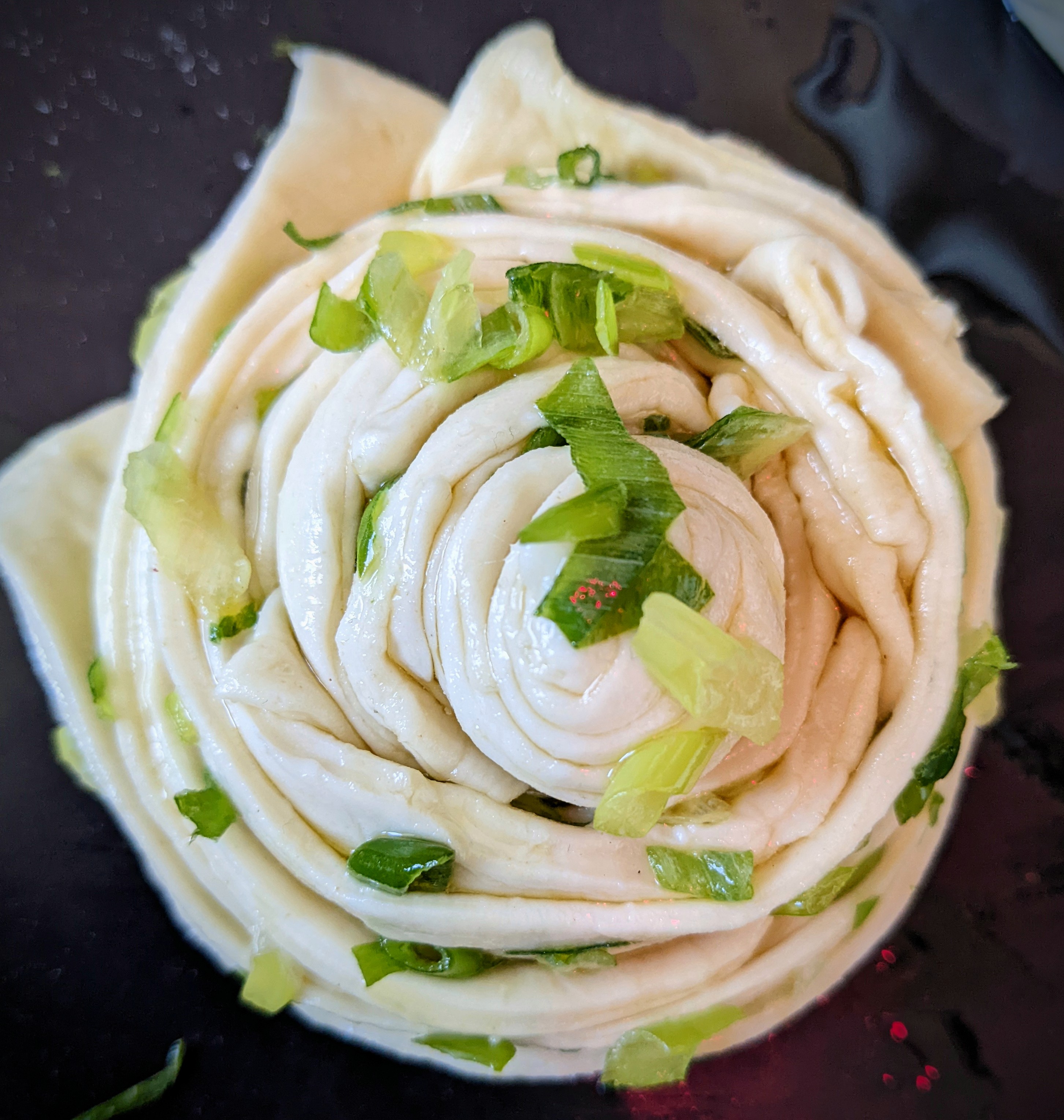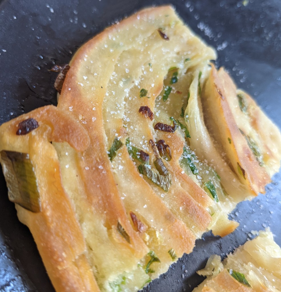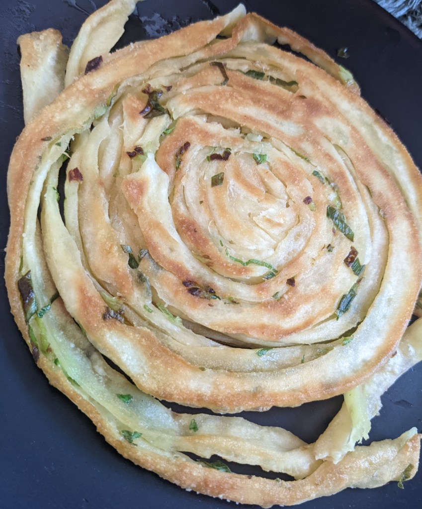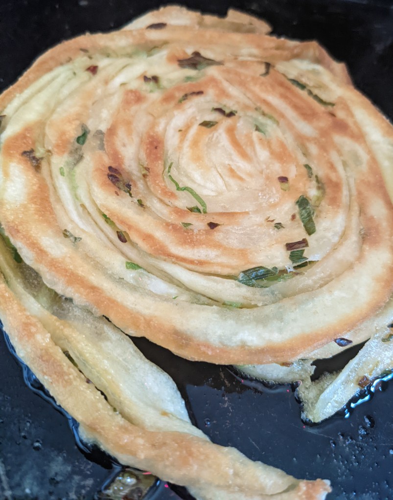Split your dough roughly into 4, and roll each out into circles, around 2mm thick. Take one pancake, spread it with olive oil and sprinkle on your scallions generously. Place another pancake on top, and roll these again. Roll to around 2mm again, it doesn’t matter if the scallions poke through.
