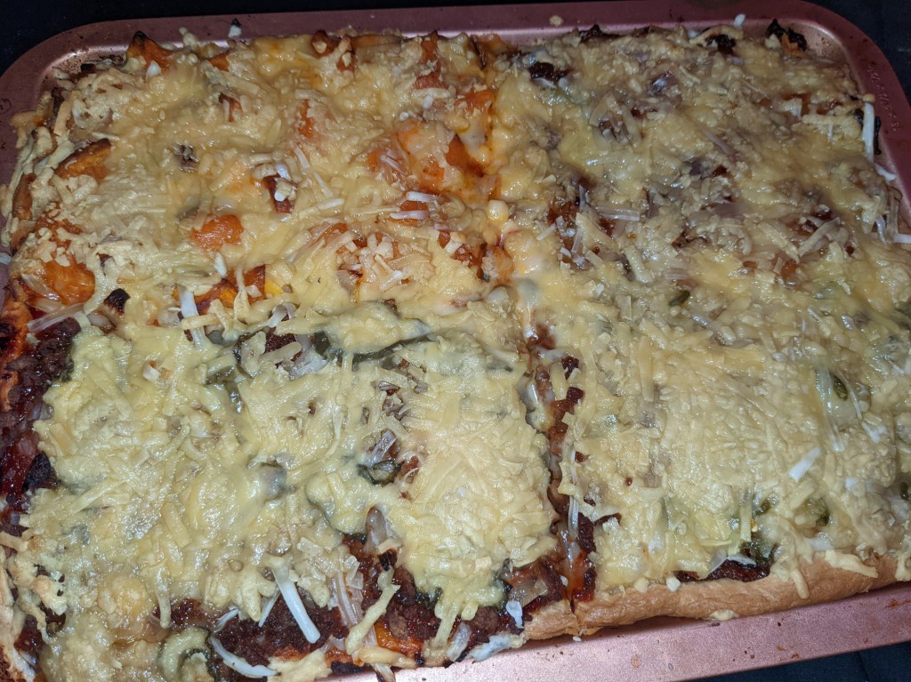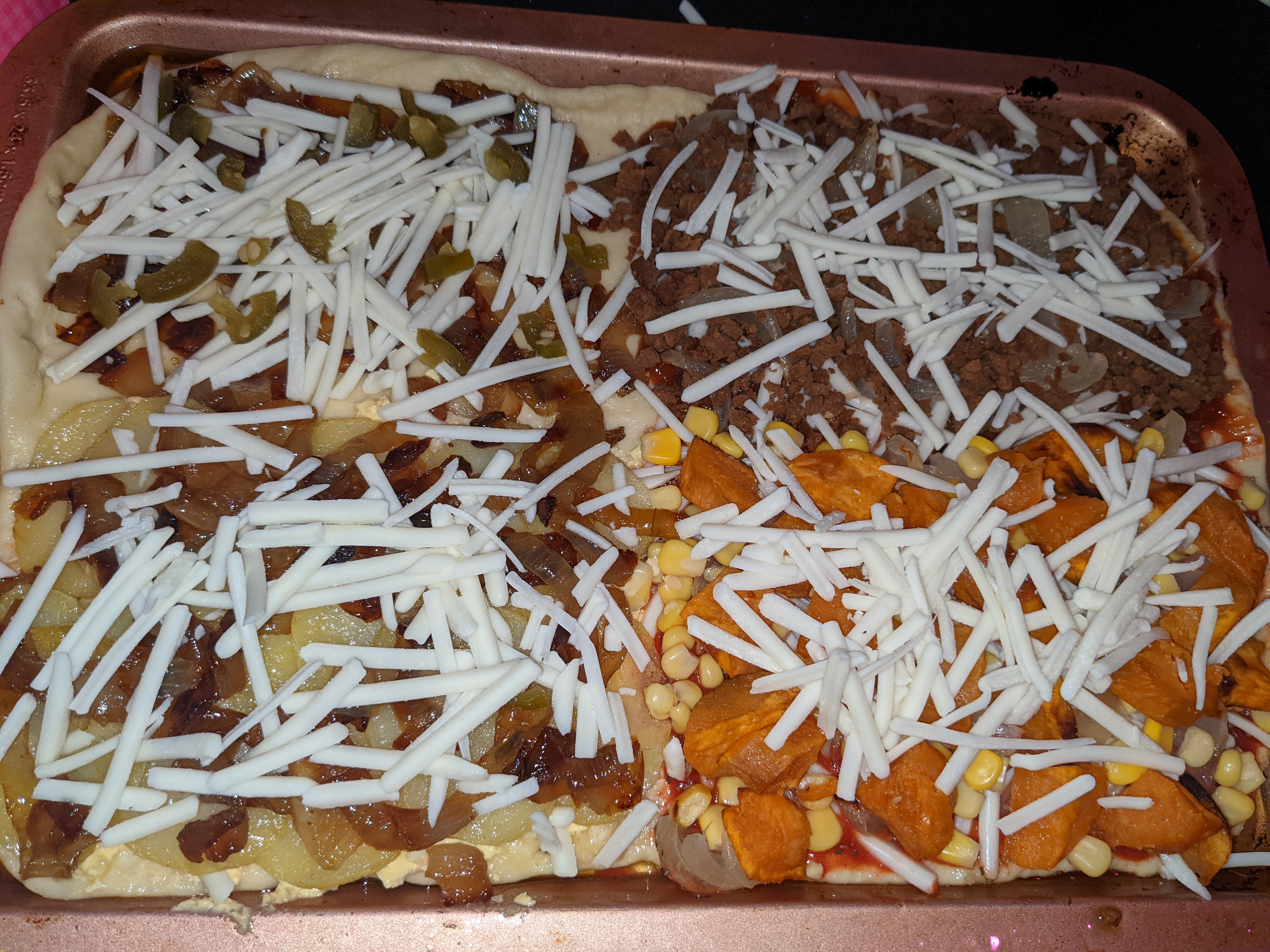 Place in the oven, ours was thick base and very topping heavy so we did 180 for 30 minutes. If your base is thin and toppings more sparing, do 180 or 190 for around 20 minutes. All ovens vary so just keep an eye on it!