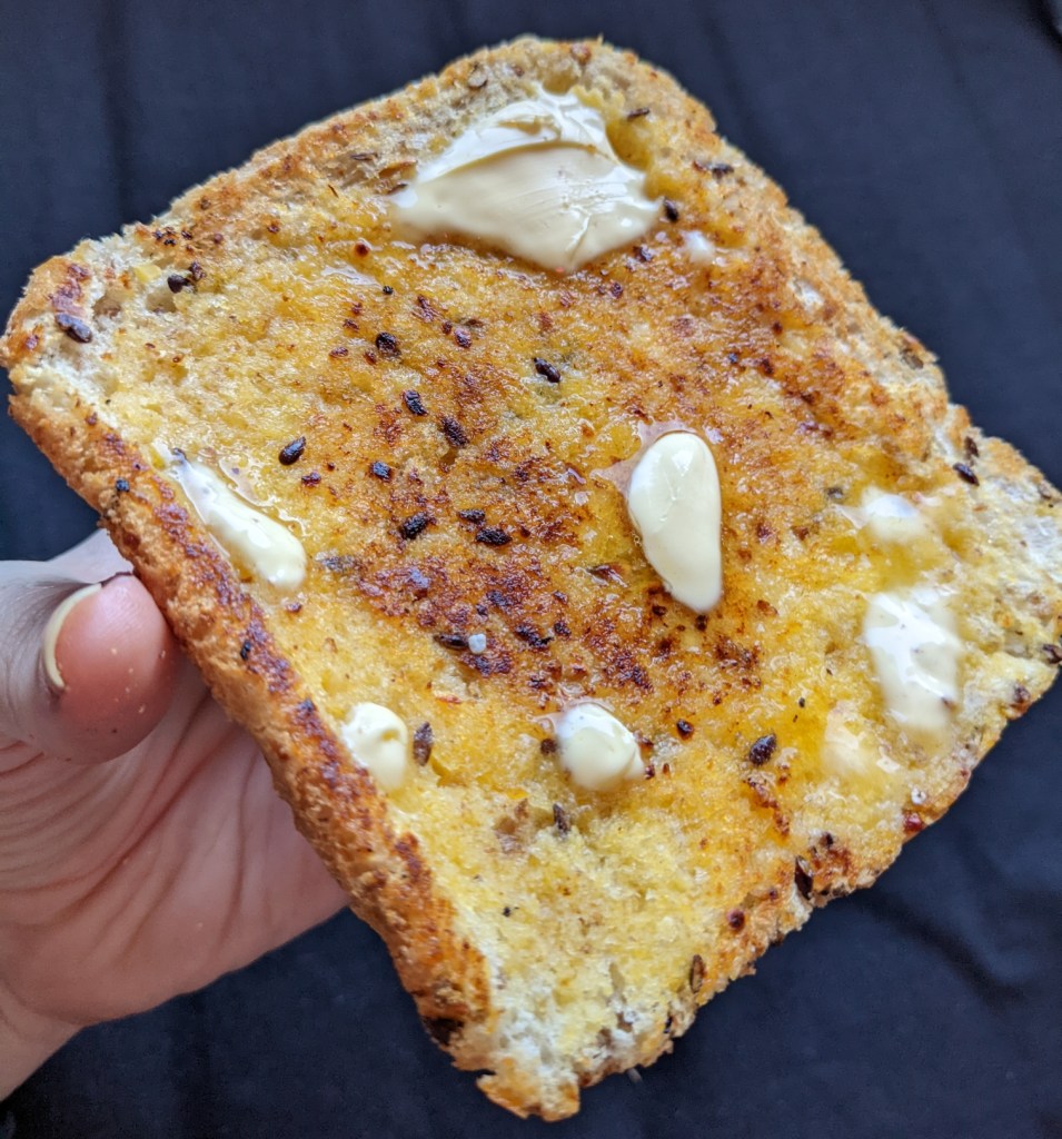 I love using grainy bread, so I used two slices of a high protein multi grain sliced bread.