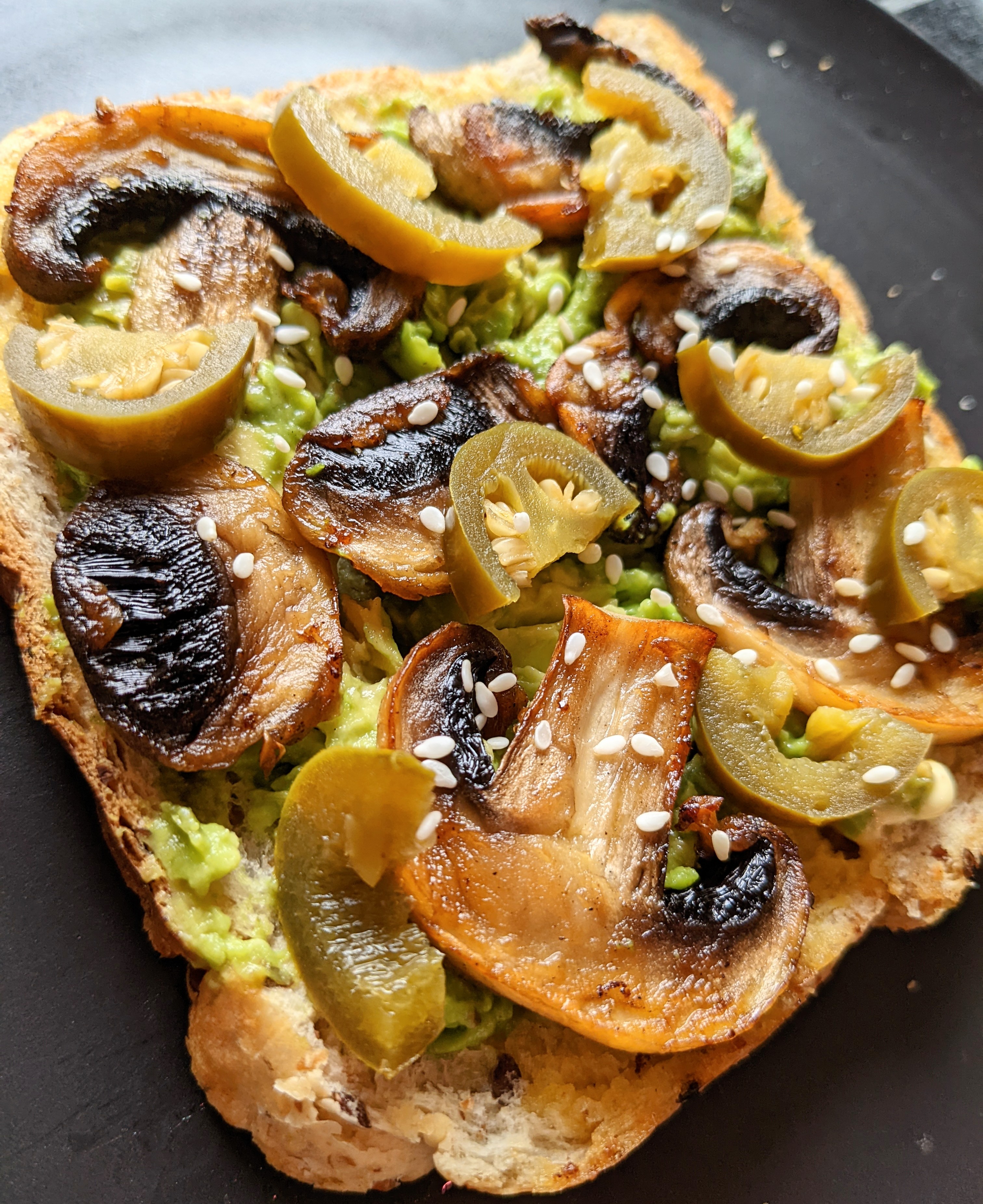 Top your avocado with your mushrooms, I also love topping with jarred fire roasted capsicum (red pepper). You can find these in jars in your local supermarket, usually stored in a seasoned oil. These give a delicious sweet pop to your toast.