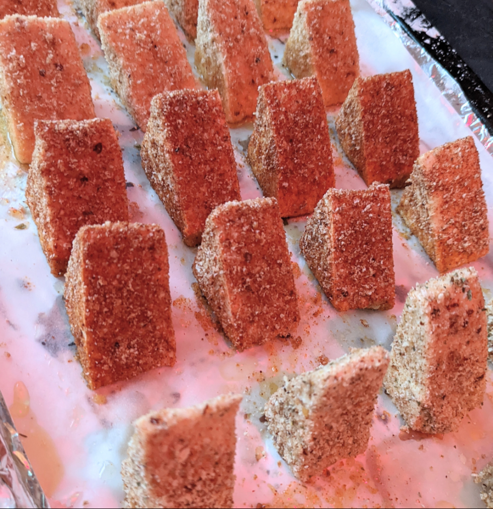 Drizzle a small amount of olive oil over the top of your tofu. This will give them a slightly fried texture. If you want to make them a little healthier you can omit this step, they will still crisp but be slightly more crumbly.