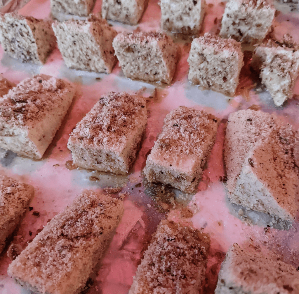 Coat your tofu in your breadcrumb mixture, patting all sides so they are heavily crumbed. Place triangles point side up on a tray lined with greaseproof paper.